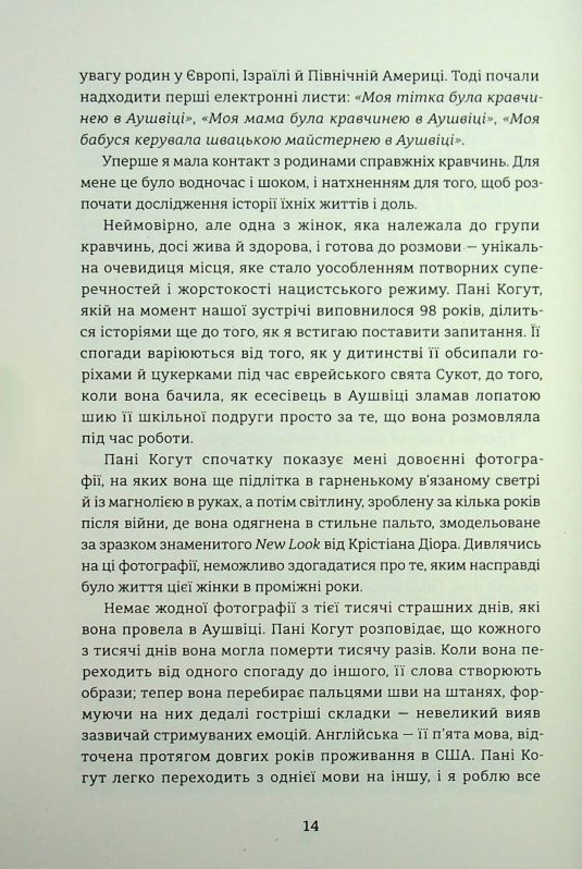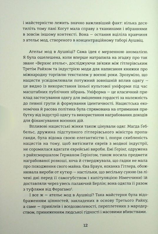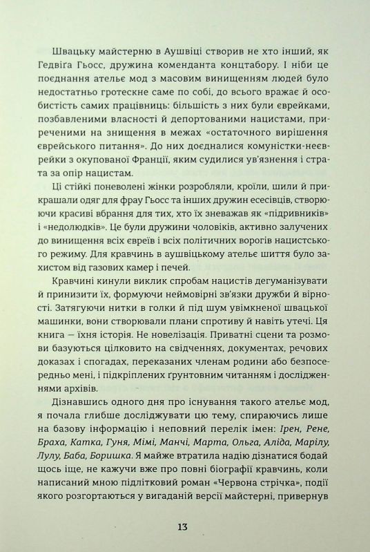 Бестселер The New York Times від дослідниці історії одягу. Це історія жінок, які в концтаборі шили найвишуканіші вбрання, аби врятуватися від газових камер Другої світової війни. Гедвіґа Гьосс, дружина коменданта Аушвіцу Рудольфа Гьосса, створила модне ательє, у якому працювало двадцять п’ять жінок — кравчинь, що виготовляли ексклюзивний жіночий одяг. Сукні та костюми їхньої роботи були елегантними й найстильнішими, а якість виробів та матеріалів — найвищою. Саме це вбрання носила берлінська еліта та вся верхівка нацистської Німеччини. Спираючись на різноманітні джерела, зокрема інтерв’ю з останньою кравчинею, яка працювала в таборовому ательє, Люсі Адлінґтон не лише розповідає про виживання жінок в умовах війни, а й викриває експлуатаційну та лицемірну політику Третього Райху. Ця історія — новий погляд на маловідомий розділ Другої світової, коли за таборовими стінами ховалася краса, яка давала ув’язненим жінкам надію на порятунок.
